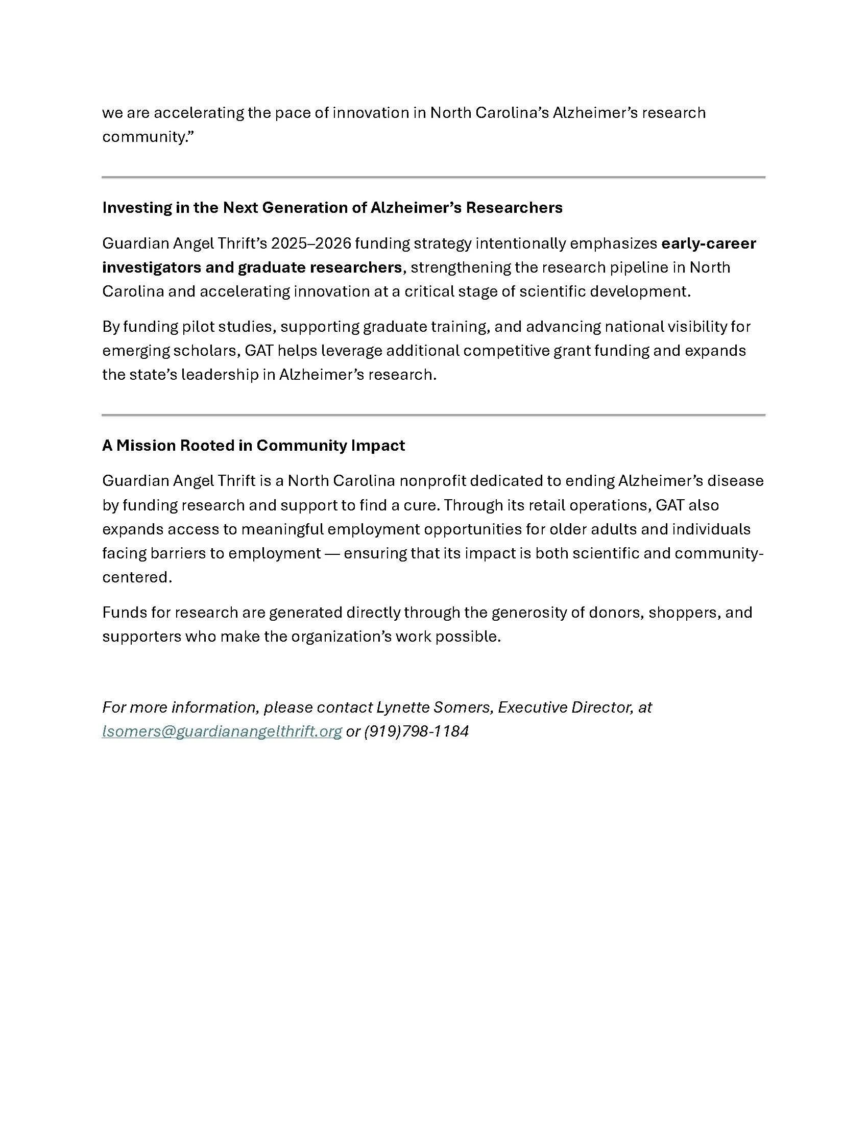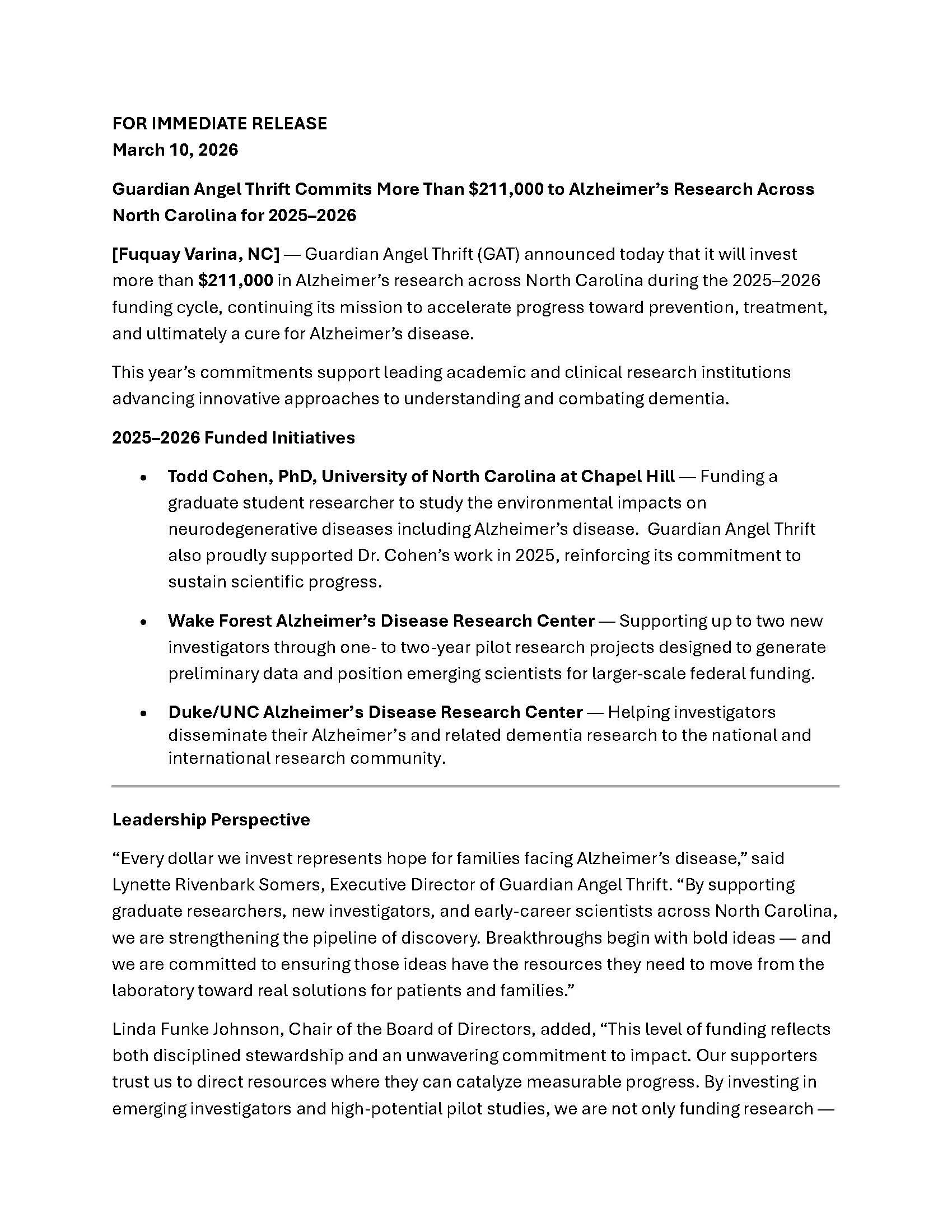 From 2003 to 2025, we partnered with the Dementia Alliance of North Carolina to support the Lina Mae Edwards Young Investigator Research Grant, empowering emerging researchers to advance the fight against Alzheimer’s.